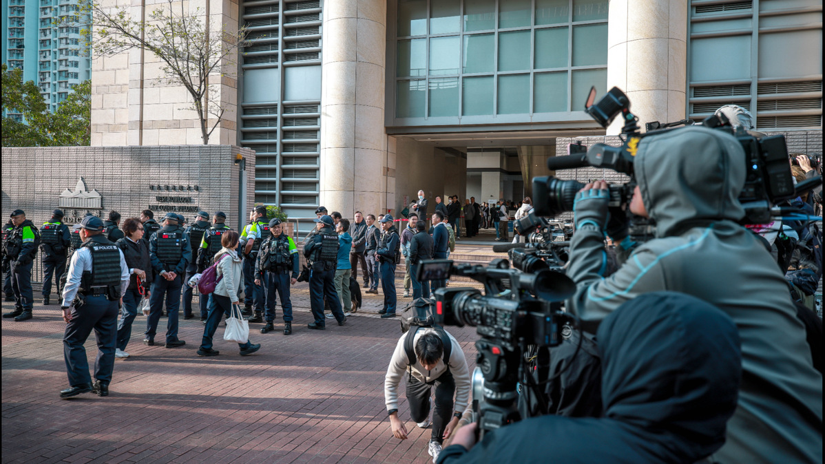 Полицейски служители стоят на стража пред сградата на съдилищата в West Kowloon в Sham Shui Po, докато представители на пресата чакат присъдата на бившия медиен магнат Джими Лай Чийинг на 9 февруари 2026 г. [ANDY CHONG/CHINA DAILY]