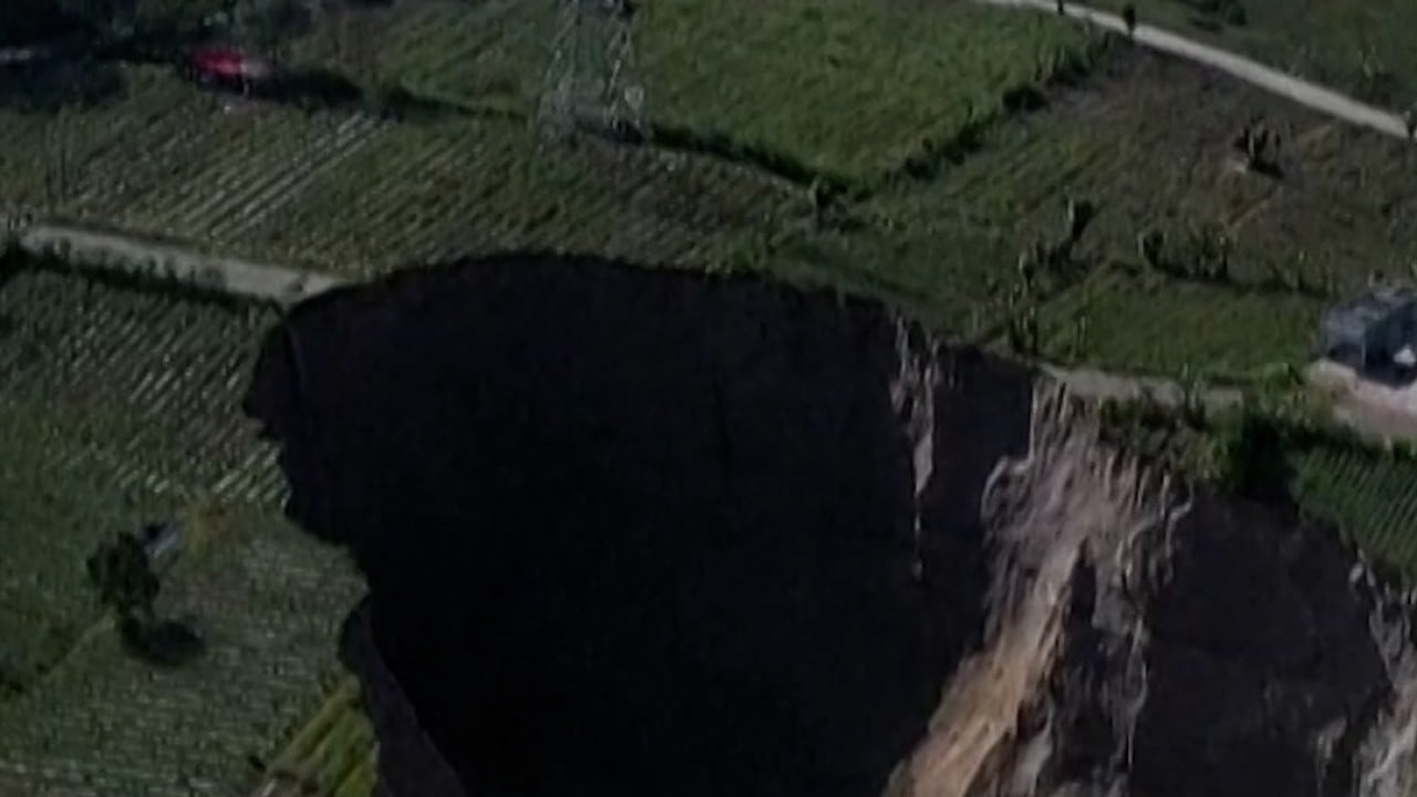 100-метрова дупка бавно погълна част от село в северозападна Индонезия. Местните фермери се борят да разширят земеделската си земя, за да избягат от настъпващия кратер.