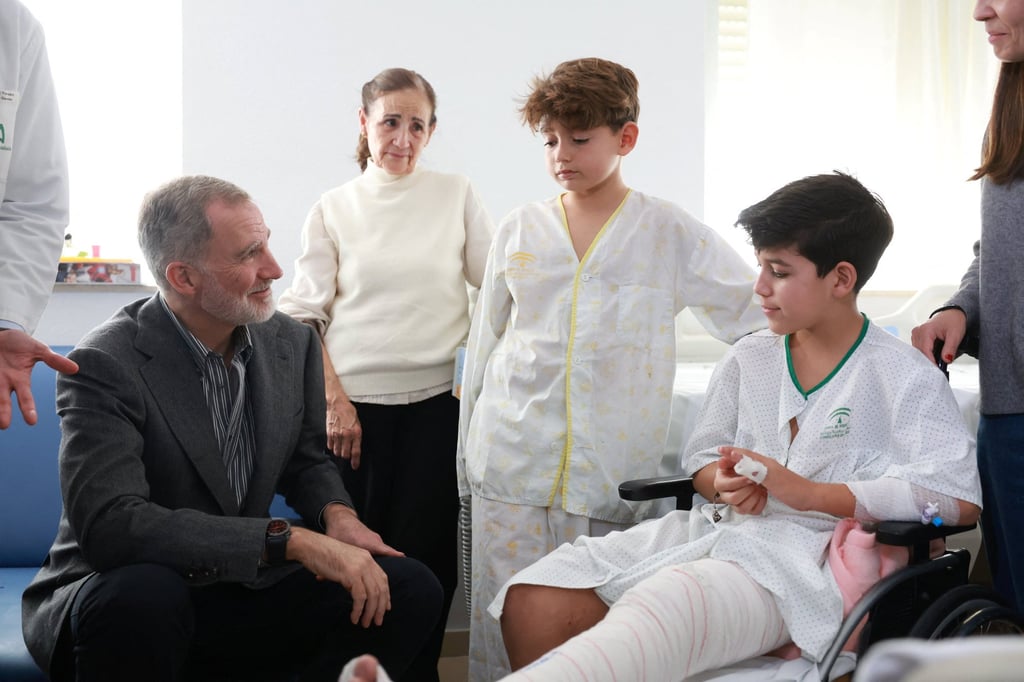 Испанският крал Фелипе разговаря с две ранени деца по време на посещението си в болница „Рейна София“ в Кордоба, Испания, във вторник. Снимка: Ройтерс