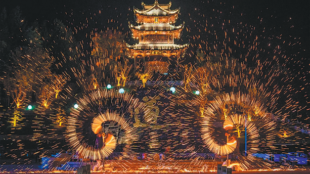Изпълнение на дашухуа, или поразителни железни цветя, заслепява зрителите с брилянтен дъжд от искри, наподобяващ корона на дърво в Хуаншан, провинция Анхуей, през октомври. КИТАЙ ДЕЙЛИ