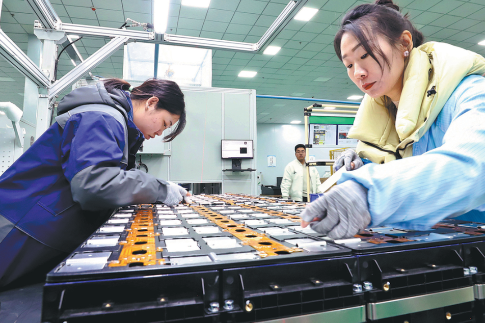 Работници сглобяват модули за съхранение на енергия в работилница в Zhangye, провинция Gansu, 3 март. WANG JIANG/ЗА КИТАЙ ДАЙЛИ