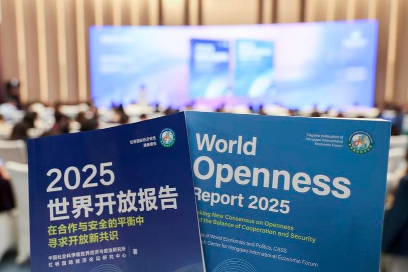 Докладът за отвореността на света 2025 е изобразен на пресконференцията относно Доклада за отвореността на света 2025 и международния симпозиум за отварянето на света по време на 8-ия международен икономически форум Hongqiao в Шанхай, Източен Китай, 5 ноември 2025 г. [Photo/Xinhua]
