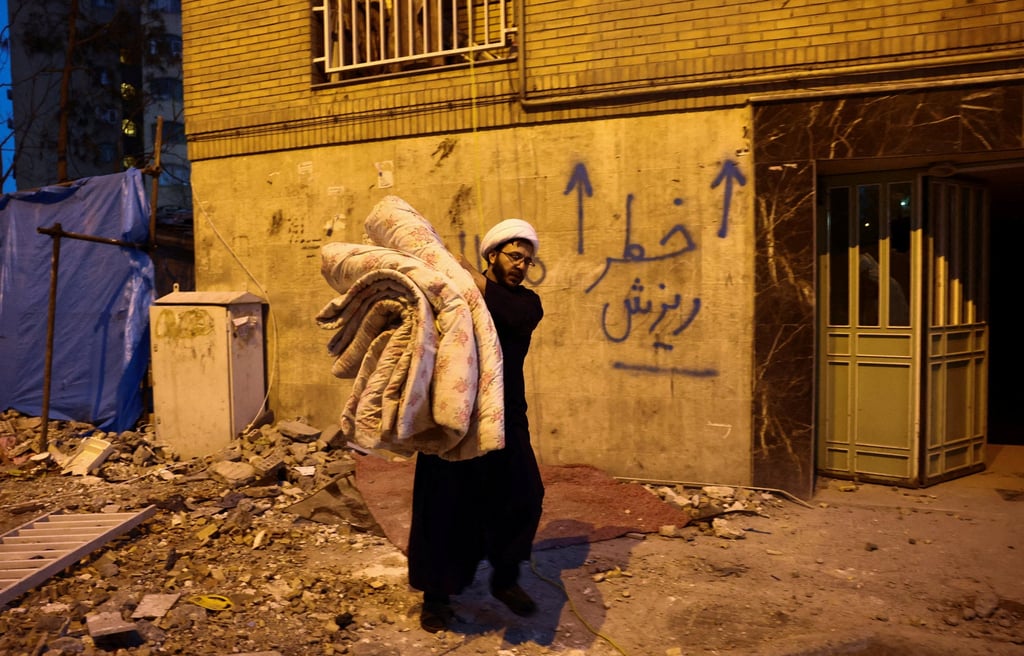 Доброволец спасява вещи от къща, повредена при стачка в Техеран в сряда. Снимка: WANA/Ройтерс