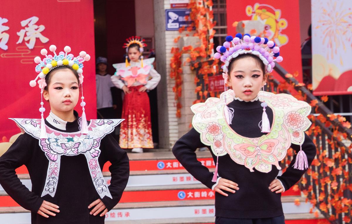 Ученици от основното училище Dajieling в Ningxiang, провинция Hunan, трансформират ежедневните материали в сложни китайски оперни украси по време на училищното събитие на Седмицата на изкуствата в сряда. [Photo provided to chinadaily.com.cn]