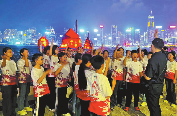 Членове на детския хор „Little River Flows“ на окръг Миду пеят патриотична песен по време на турне в Хонг Конг през октомври 2024 г. CHINA DAILY