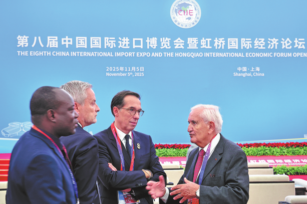 Чуждестранни участници разговарят по време на церемонията по откриването на осмото Китайско международно изложение за внос и международния икономически форум Hongqiao в Шанхай на 5 ноември. WANG JING/CHINA DAILY