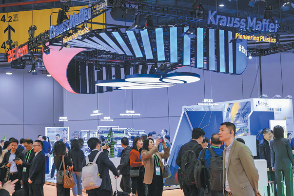 Посетителите се събират на щанда на KraussMaffei по време на 8-то Китайско международно изложение за внос в Шанхай на 6 ноември. CHINA DAILY